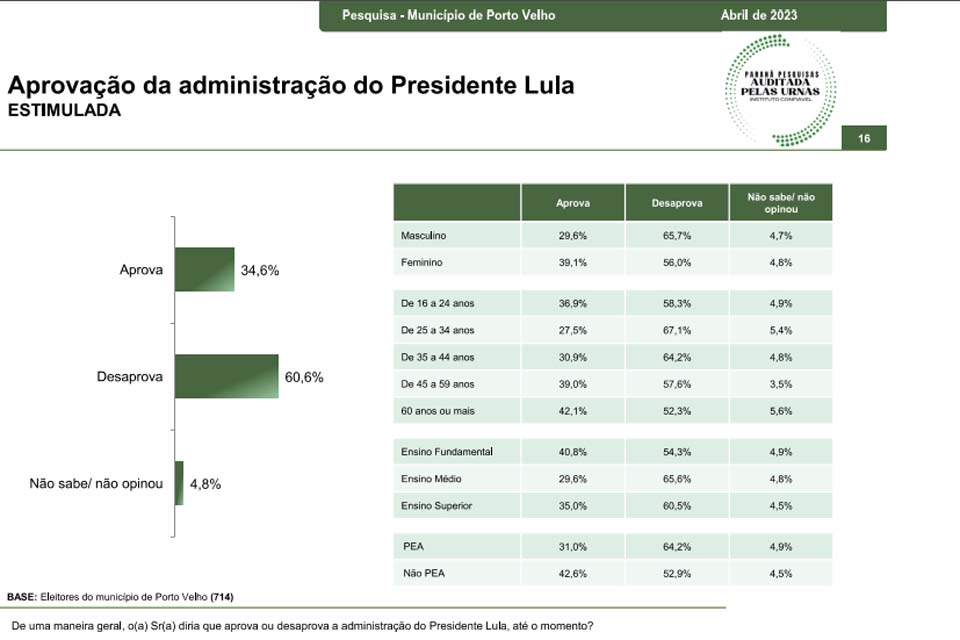 São 60,6% de desaprovação enquanto 34,6% aprovam o presidente Lula, do PT.