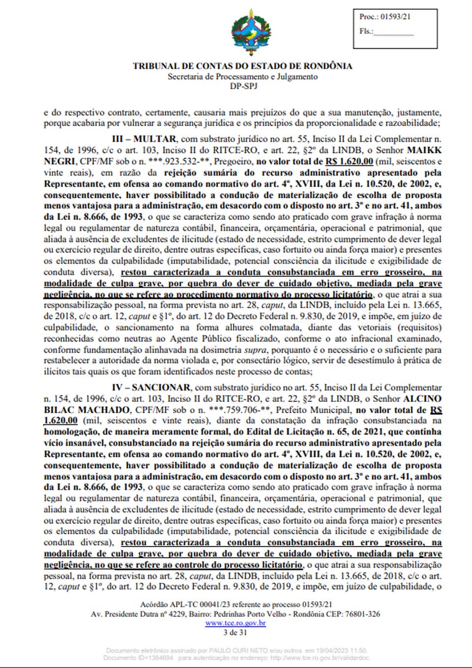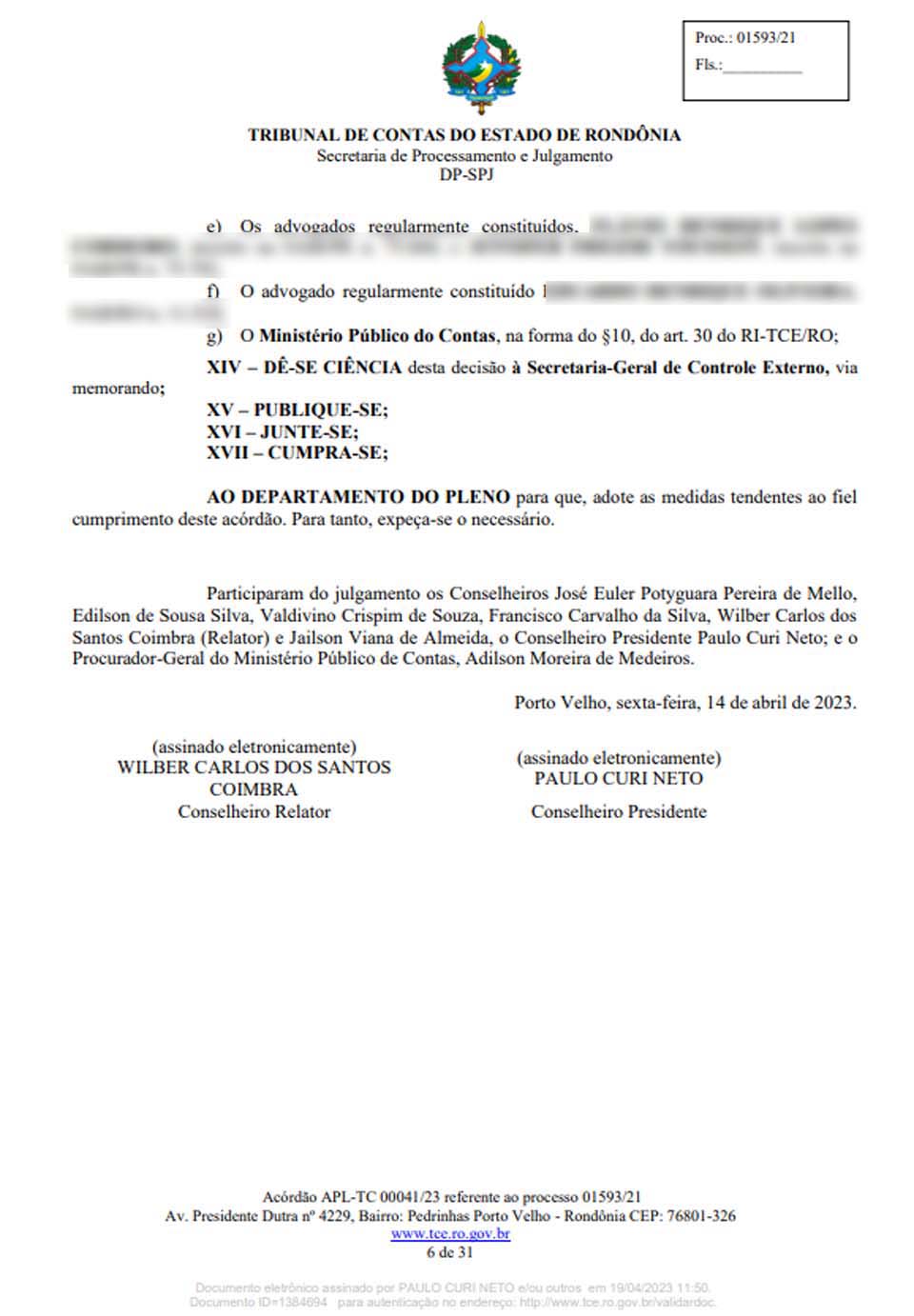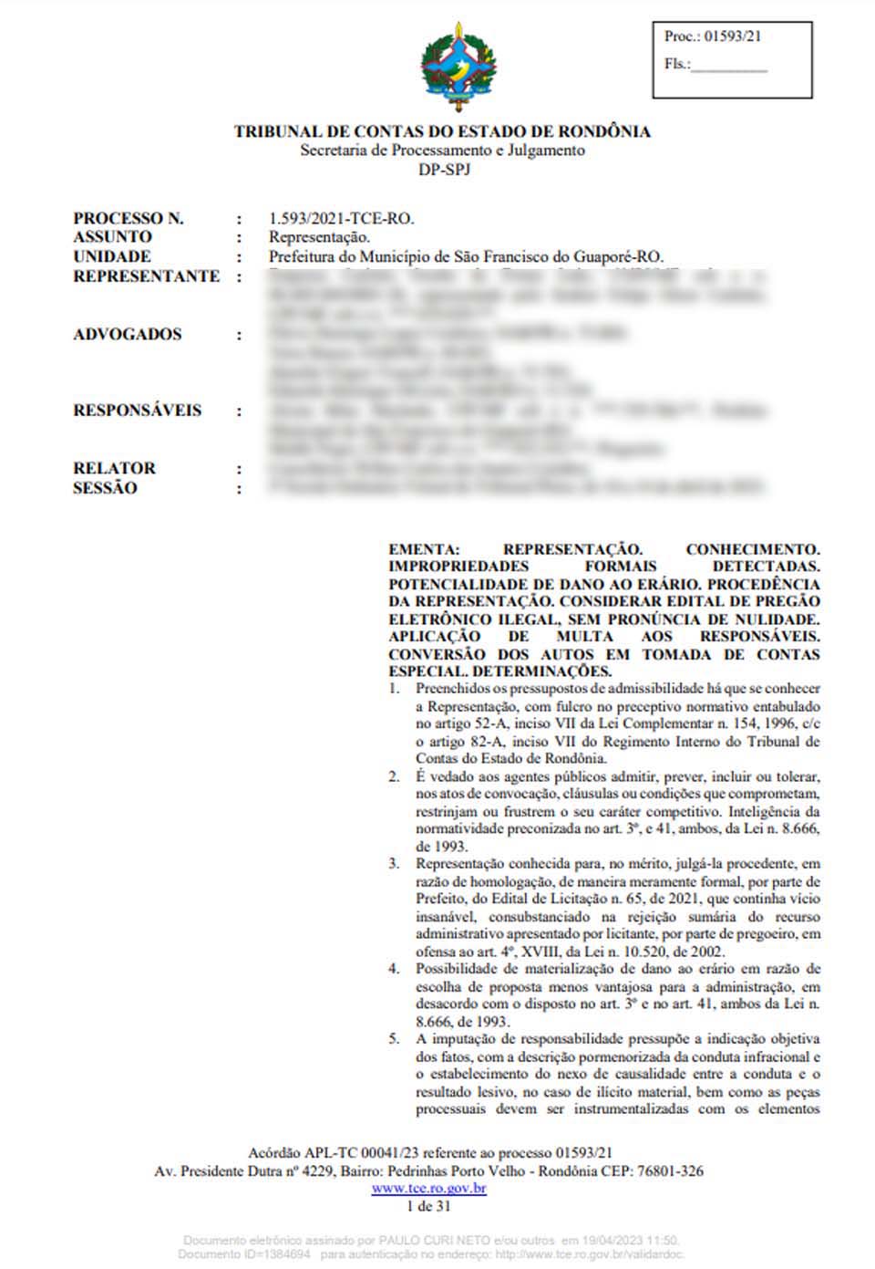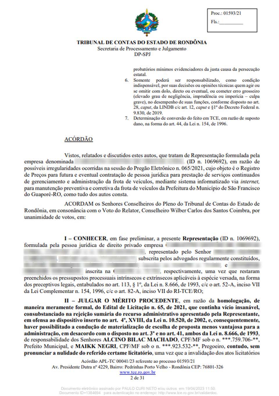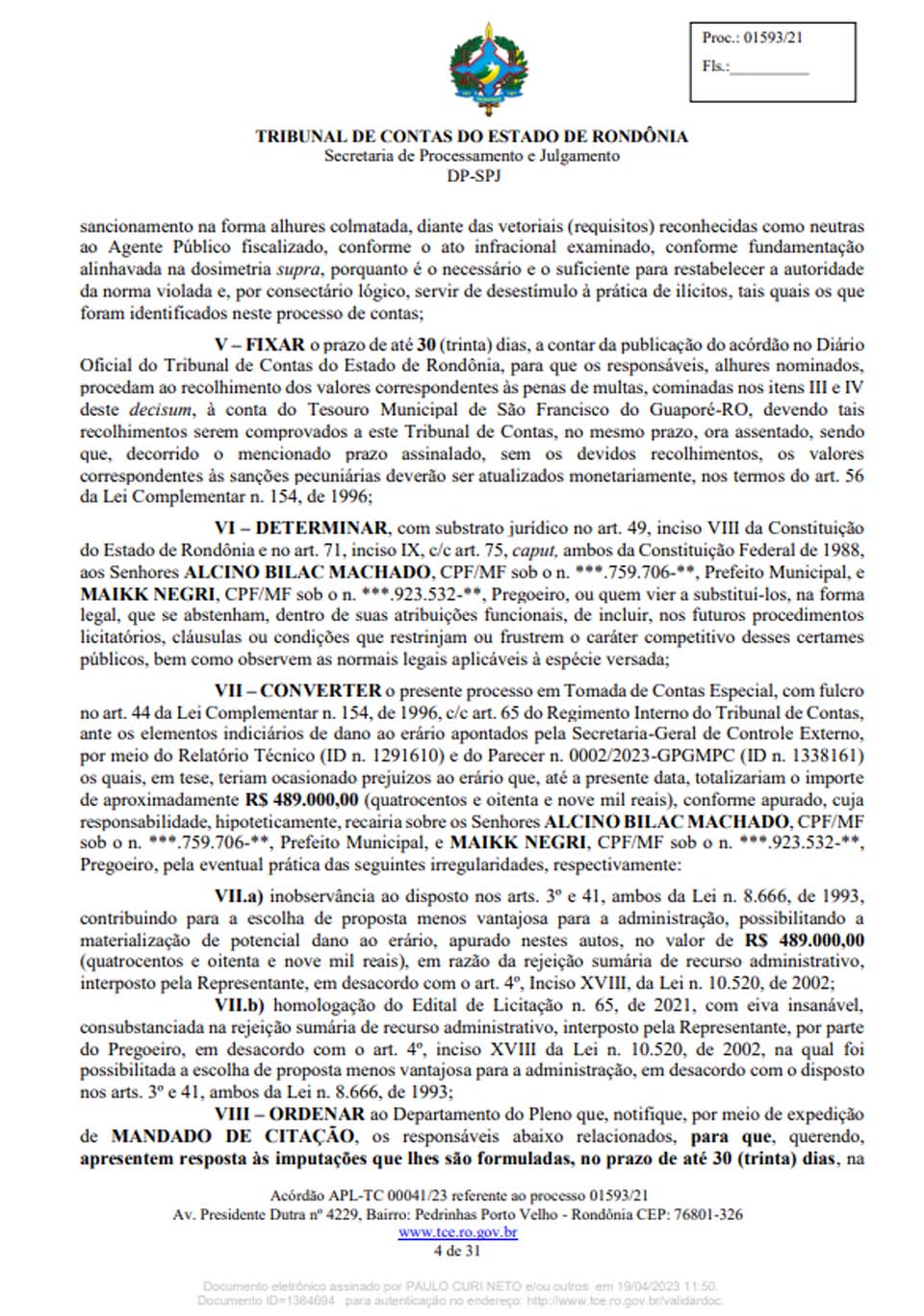 Eles têm 30 dias para que “procedam ao recolhimento dos valores correspondentes às penas de multas, cominadas nos itens III e IV deste decisum, à conta do Tesouro Municipal de São Francisco do Guaporé-RO”.