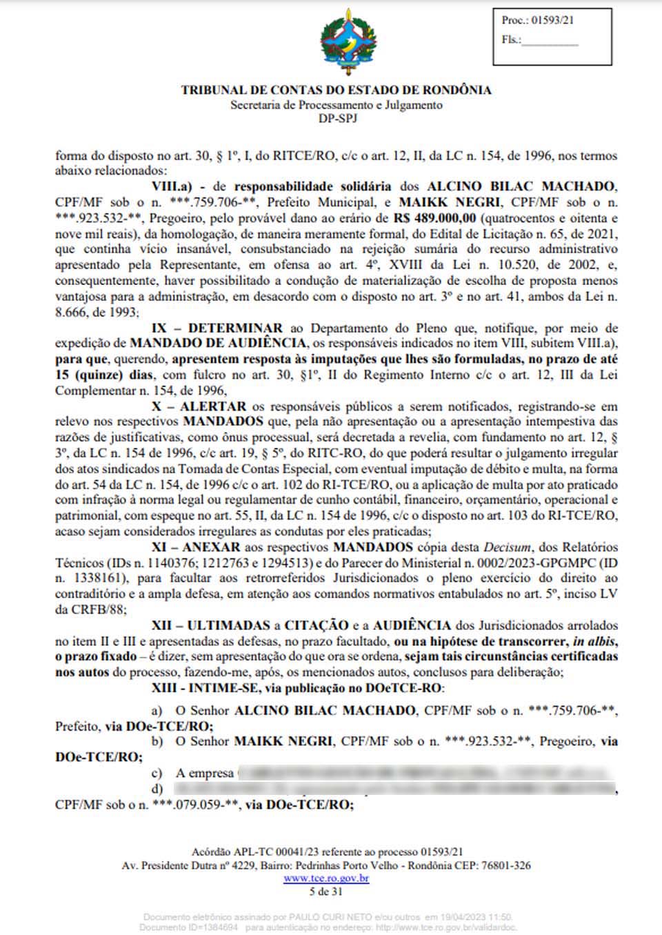 Além dele, o pregoeiro municipal Maikk Negri também deve justificativas aos conselheiros em decorrência das eventuais irregularidades perpetradas por ambos.