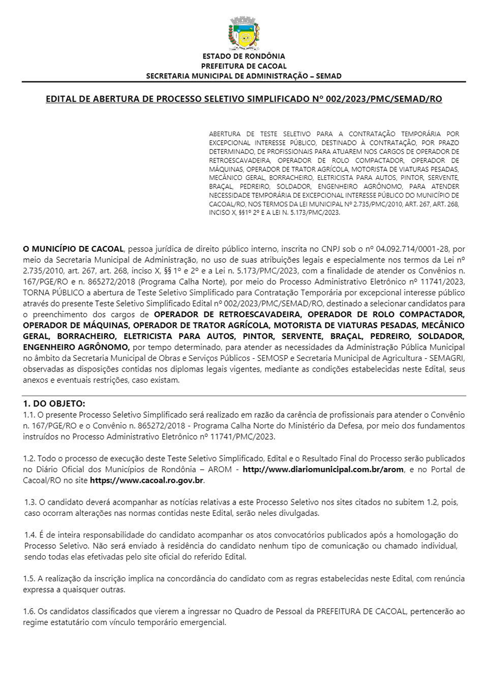 A Prefeitura de Cacoal, por meio da Secretaria Municipal de Administração, divulgou nesta segunda-feira o Edital nº 002/2023/PMC/SEMAD/RO, destinado a selecionar candidatos para o preenchimento dos cargos de OPERADOR DE RETROESCAVADEIRA, OPERADOR DE ROLO COMPACTADOR, OPERADOR DE MÁQUINAS, OPERADOR DE TRATOR AGRÍCOLA, MOTORISTA DE VIATURAS PESADAS, MECÂNICO GERAL, BORRACHEIRO, ELETRICISTA PARA AUTOS, PINTOR, SERVENTE, BRAÇAL, PEDREIRO, SOLDADOR, ENGENHEIRO AGRÔNOMO, por tempo determinado, para atender as necessidades da Administração Pública Municipal no âmbito da Secretaria Municipal de Obras e Serviços Públicos – SEMOSP – e Secretaria Municipal de Agricultura – SEMAGRI – observadas as disposições contidas nos diplomas legais vigentes, mediante as condições estabelecidas neste Edital.