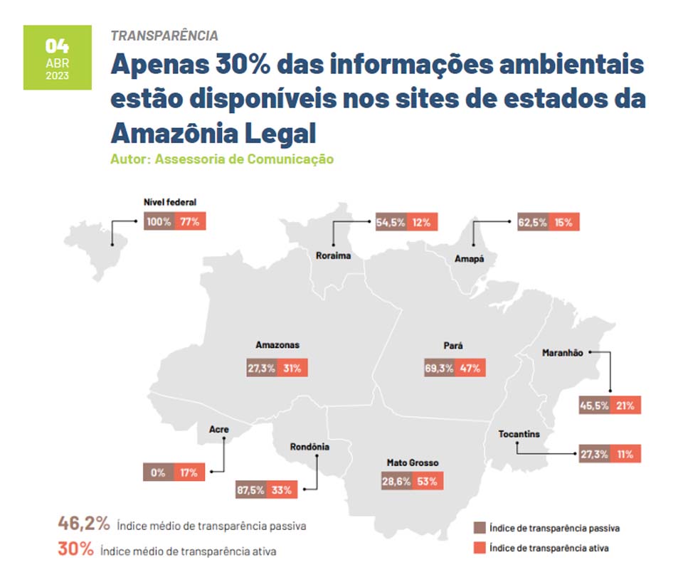 “Entidades e órgãos dos 9 estados da Amazônia Legal disponibilizam em seus websites apenas 30% das informações necessárias para controle, regularização e tomada de decisões relacionadas ao meio ambiente”.