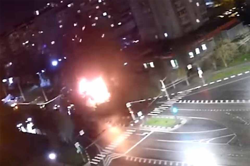 Um carro capotado foi parar no telhado de uma loja após a explosão, de acordo com a RIA Novosti.