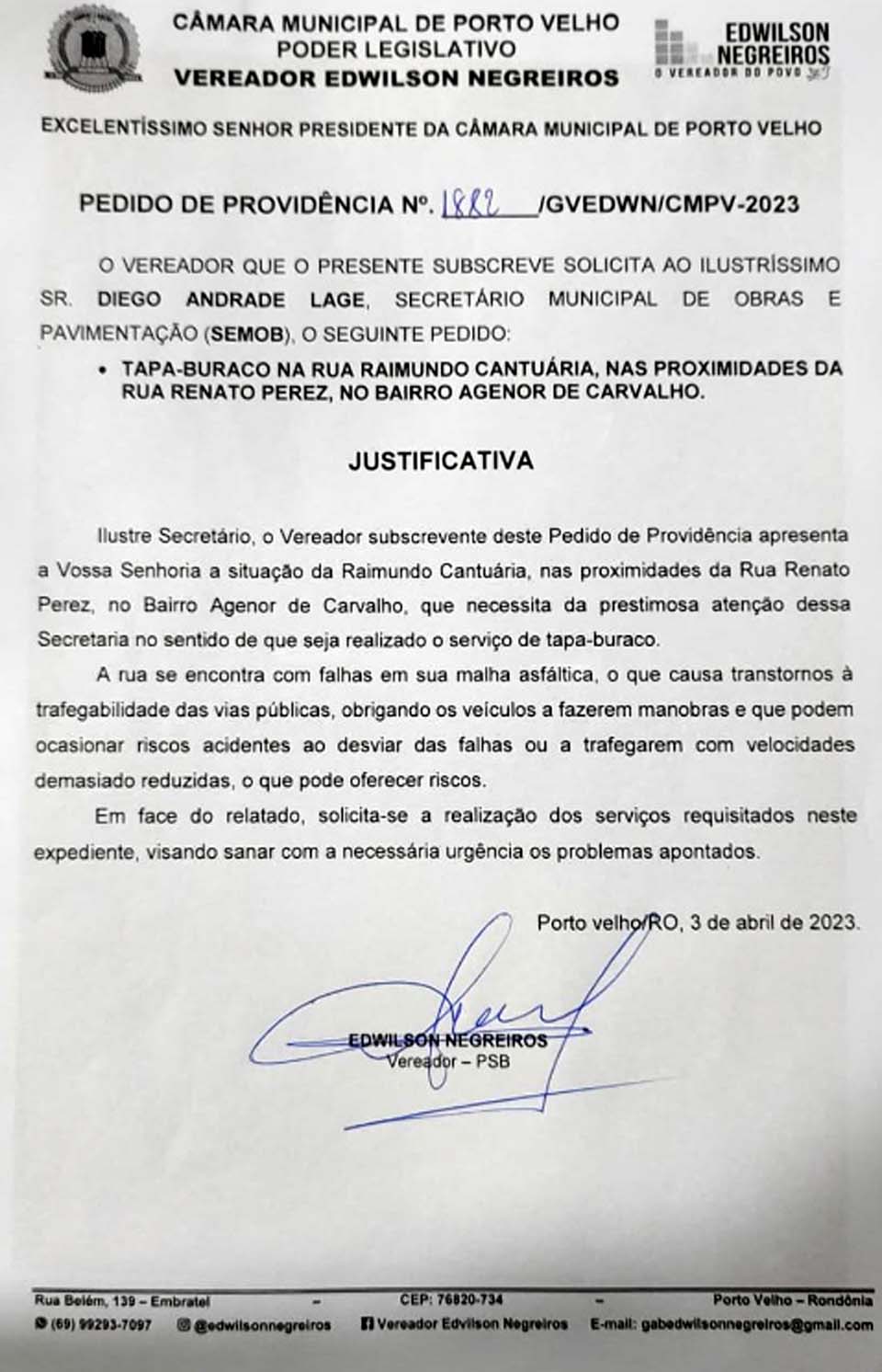 Porto Velho, RO – O vereador da Câmara da Capital Edwilson Negreiros, do PSB, pediu providências e a Prefeitura de Porto Velho determinou serviços de tapa-buracos na Avenida Raimundo Cantuária, nas proximidades da Rua Renato Perez, região situada no Bairro Agenor de Carvalho, zona Leste.