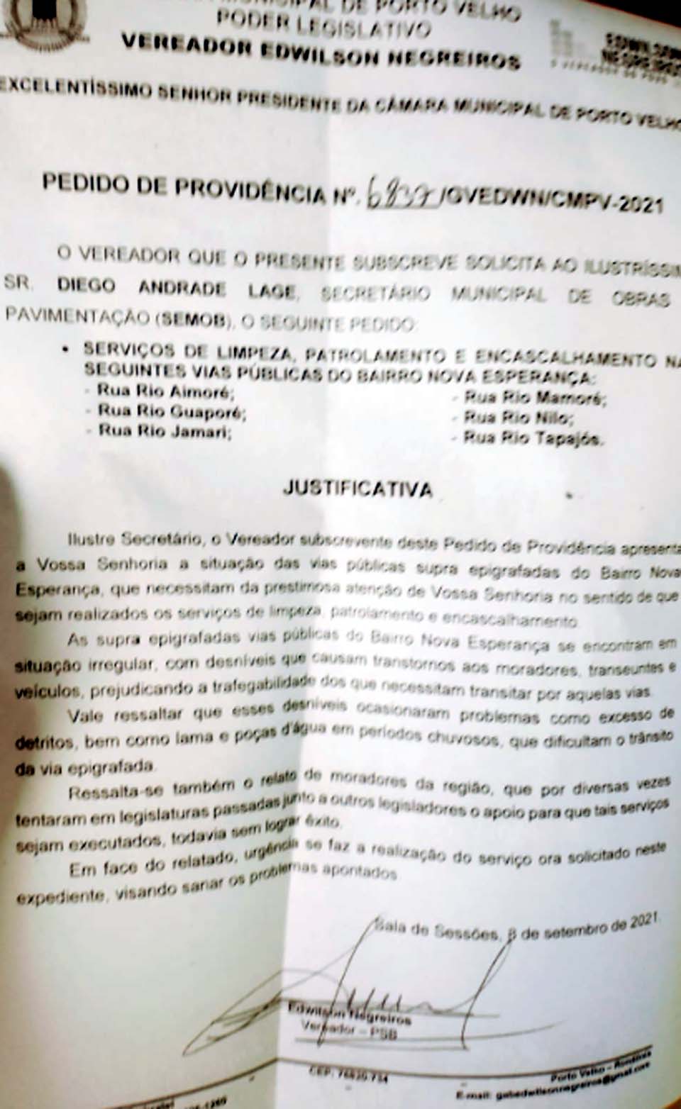 Porto Velho, RO – O vereador da Câmara Municipal Edwilson Negreiros, do PSB, encaminhou novo Pedido de Providências à Prefeitura de Porto Velho para atender o Bairro Nova Esperança, situado à Zona Norte da Capital.