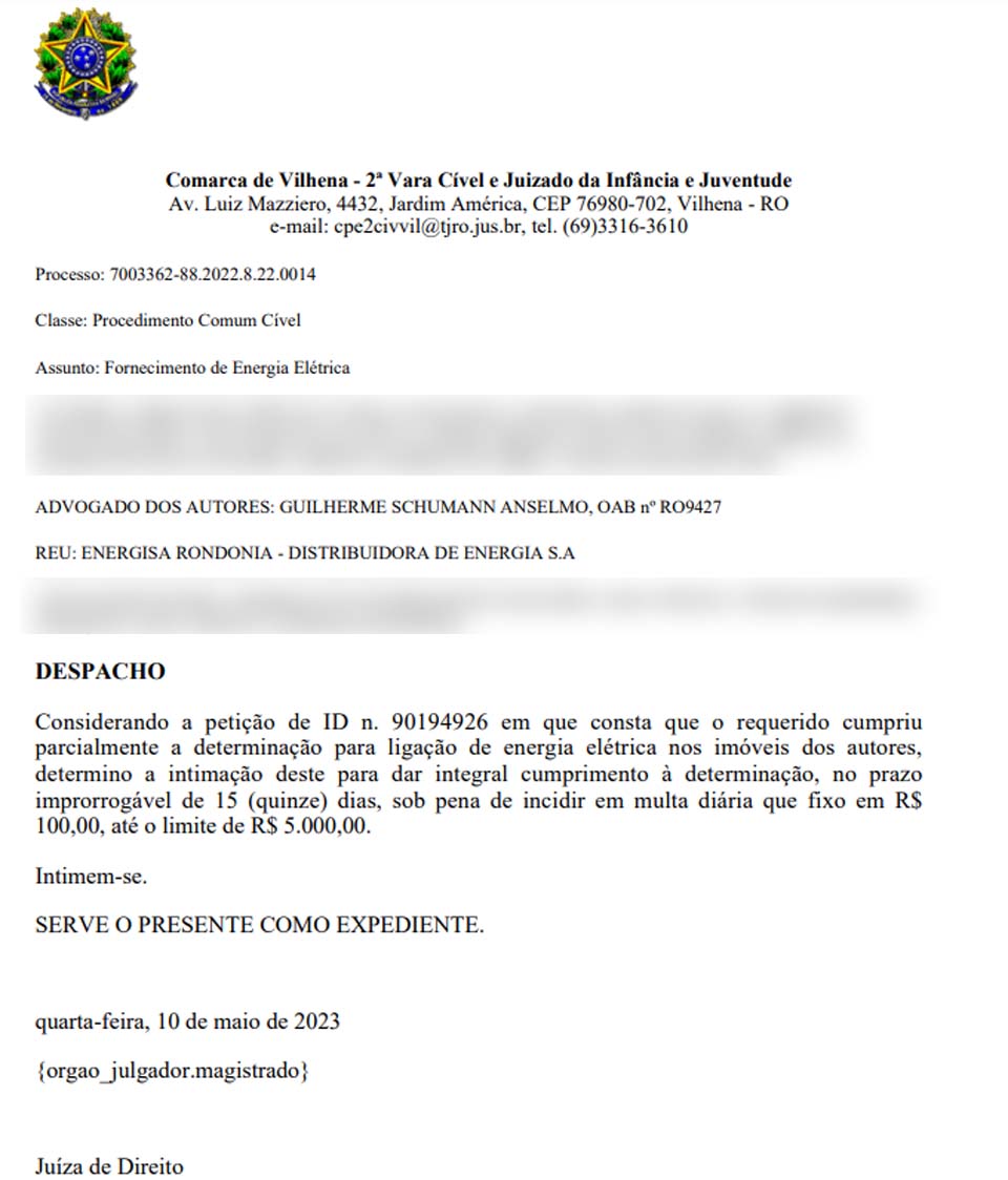 “Considerando a petição de ID n. 90194926 em que consta que o requerido cumpriu parcialmente a determinação para ligação de energia elétrica nos imóveis dos autores, determino a intimação deste para dar integral cumprimento à determinação, no prazo improrrogável de 15 (quinze) dias, sob pena de incidir em multa diária que fixo em R$ 100,00, até o limite de R$ 5.000,00”, indicou a magistrada.