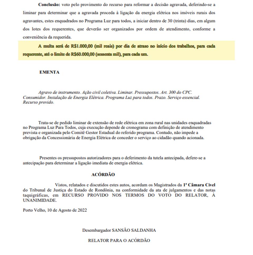 Porto Velho, RO – Na última quarta-feira (10), a juíza de Direito Kelma Vilela de Oliveira, da 2ª Vara Cível de Vilhena, renovou a possibilidade de multa a ser aplicada contra a Energisa Rondônia.