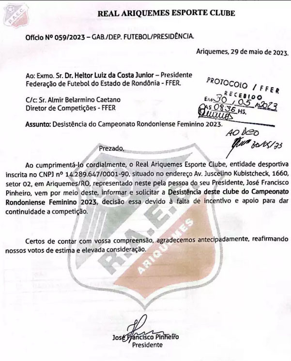 A decisão de estender o prazo de inscrições na competição, foi necessária após a desistência do Clube Real Ariquemes, o time do vale do Jamari encaminhou na última segunda feira (29) ofício à FFER comunicando a desistência do Rondoniense Feminino 2023.