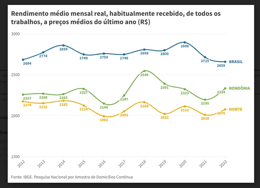 A Pesquisa Nacional por Amostra de Domicílios Contínua (PNAD Contínua) indica que houve estabilidade ao longo da série histórica em relação aos rendimentos médios habitualmente recebidos pelos rondonienses por todos os trabalhos. Em valores corrigidos, no ano de 2012, um trabalhador rondoniense recebia mensalmente em média R$ 2.257,00, passando para R$ 2.334,00 no ano de 2022.