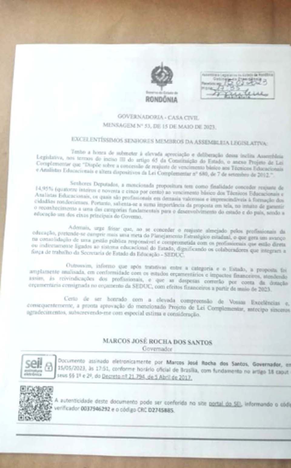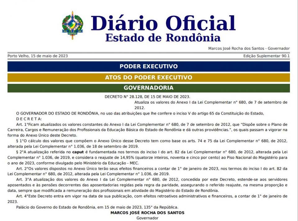 Em edição suplementar nesta segunda-feira (15/05), a Secretaria de Estado da Educação (Seduc) publicou o Decreto nº 28.128/2023, que atualiza o Piso do Magistério de 2023 no percentual de 14,95%. Também foi encaminhado à Assembleia Legislativa do Estado de Rondônia (ALE/RO), a Mensagem nº 53/2023 que propõe a aprovação do Projeto de Lei que trata do reajuste salarial no mesmo percentual de 14/95% aos técnicos e técnicas educacionais.