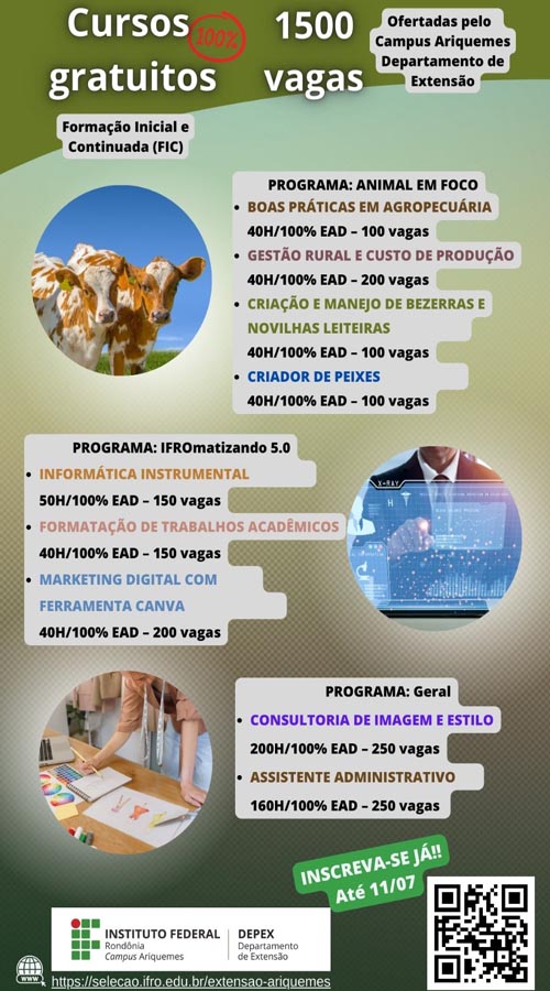 O Instituto Federal de Educação, Ciência e Tecnologia de Rondônia (IFRO), Campus Ariquemes, abriu novas ofertas de Cursos de Formação Inicial e Continuada (FIC) ofertadas na modalidade de educação a distância (EaD). A ação faz parte dos Programas de Extensão “Animal em Foco e IFROmatizando 5.0” realizados pelo Departamento de Extensão (Depex/IFRO/Ariquemes). A inscrição segue aberta até 11 de julho de 2023.