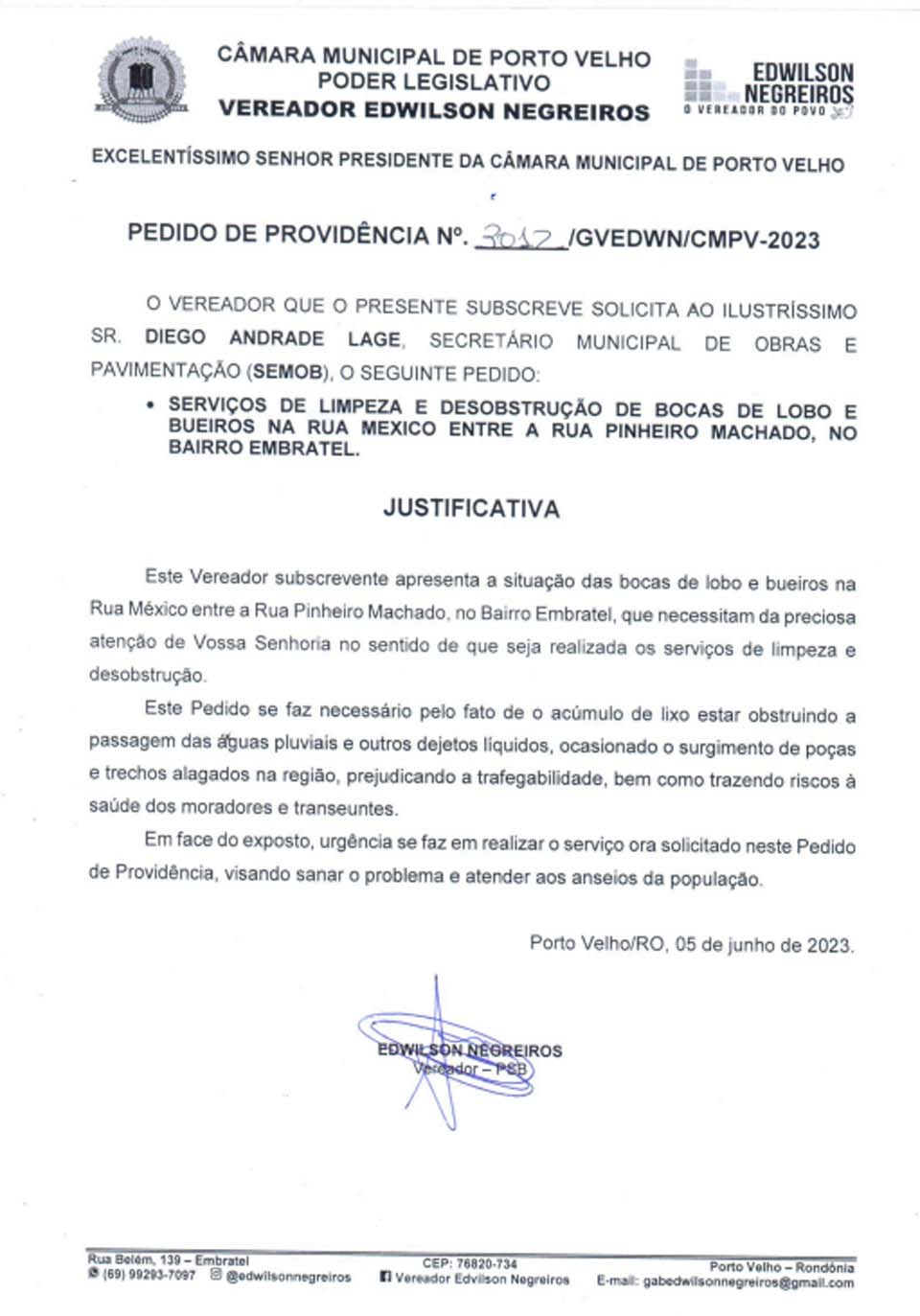 Porto Velho, RO – Um Pedido de Providência apresentado pelo vereador Edwilson Negreiros, do PSB, se transformou em serviços executado na cidade. Negreiros enviou Ofício a Diego Andrade Lage, titular da Secretaria Municipal de Obras (SEMOB) abordando a necessidade de promoção de serviços de limpeza e desobstrução de bocas de "lobo" e bueiros na Rua México com a Avenida Pinheiro Machado, no Bairro Embratel, zona Norte.