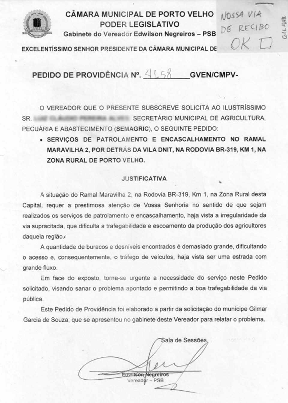 Porto Velho, RO – A Prefeitura de Porto Velho atendeu mais um pedido apresentado pelo Gabinete do vereador Edwilson Negreiros, do PSB, membro da Casa de Leis municipal.