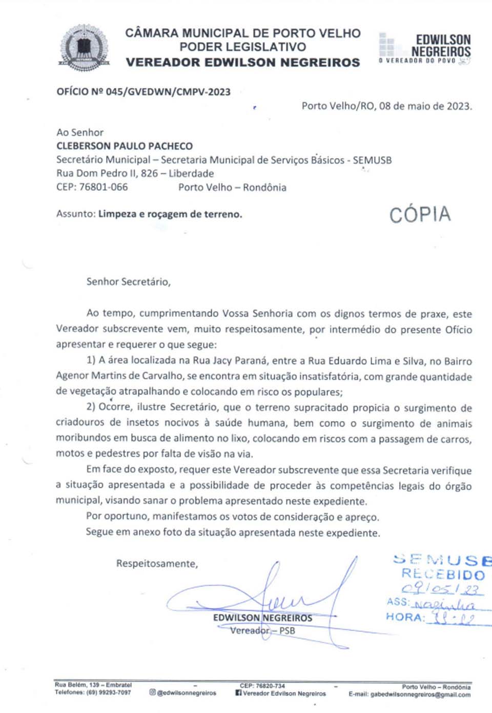 O pleito foi encaminhado ao titular da Secretaria Municipal de Serviços Básicos (SEMUSB), Cleberson Paulo Pacheco.