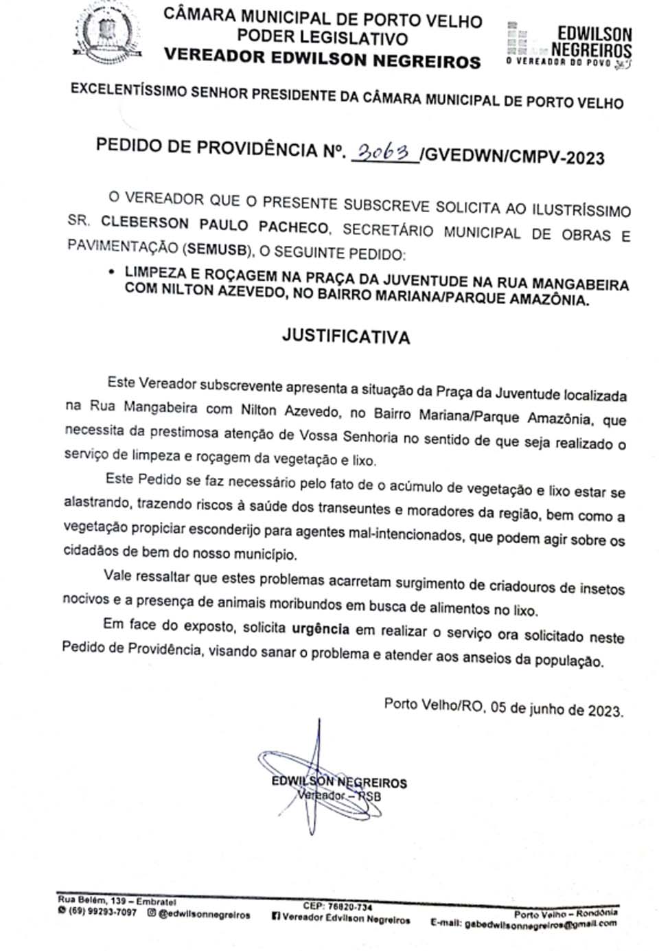 Porto Velho, RO – O vereador Edwilson Negreiros, do PSB, solicitou trabalho operacional no bairro Mariana/Parque da Amazônia, zona Leste da cidade.