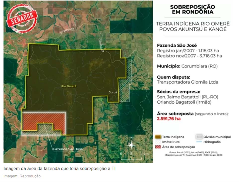 Porto Velho, RO – De acordo com matéria veiculada pelo portal UOL, em notícia assinada pelo colunista Carlos Madeiro, o senador de Rondônia Jaime Bagattoli, do PL, seria sócio-proprietário de uma empresa cuja propriedade estaria invadindo Terra Indígena no estado.