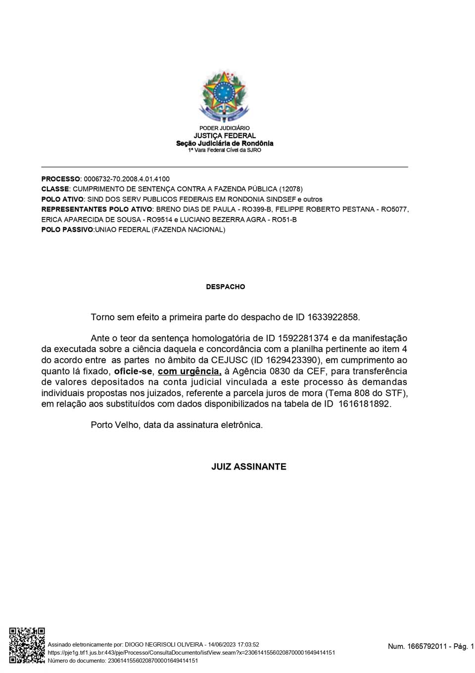 No despacho, o juiz federal determinou que a Agência 0830 da CEF disponibilize os valores referentes às parcelas de juros moratórios (Tema 808 dos STF) nos processos em que houve acordo no Centro Judiciário de Conciliação/CEJUC-RO, conforme relação já apresentada em juízo.
