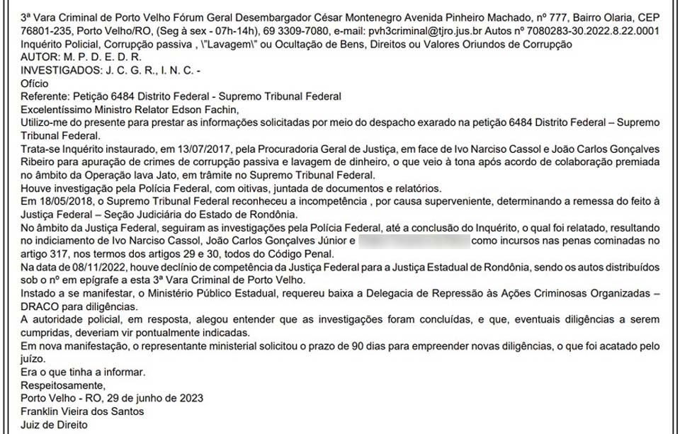 O magistrado presta informações ao ministro Edson Fachin, do Supremo Tribunal Federal (STF), a respeito de um processo em que o ex-governador Ivo Cassol, do Progressista, responde a acusações envoltas ao âmbito da Operação Lava Jato.