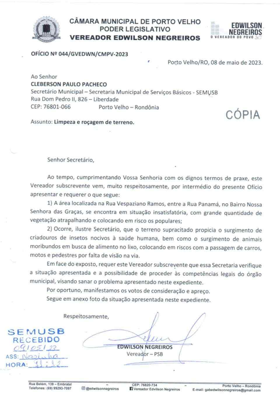 Porto Velho, RO – A pedido do vereador Edwilson Negreiros, do PSB, a Prefeitura de Porto Velho determinou a limpeza e roçagem de um terreno situado entre as ruas Vespaziano Ramos e Panamá, Bairro Nossa Senhora das Graças, Centro da Capital.