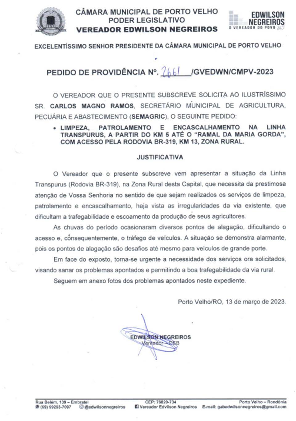 Porto Velho, RO – A Prefeitura de Porto Velho atendeu mais um pedido apresentado pelo Gabinete do vereador Edwilson Negreiros, do PSB, membro da Casa de Leis municipal.