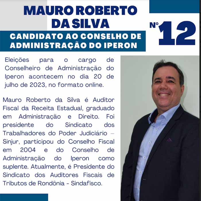Mauro Roberto é Auditor Fiscal da Receita Estadual, graduado em Administração e Direito. Foi presidente do Sindicato dos Trabalhadores do Poder Judiciário – Sinjur, participou do Conselho Fiscal há 20 anos e do Conselho de Administração do Iperon como suplente. Atualmente, é Presidente do Sindicato dos Auditores Fiscais de Tributos de Rondônia - Sindafisco.