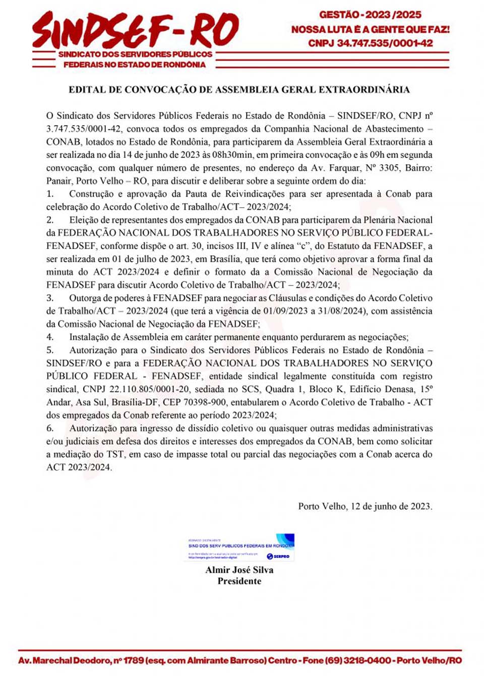 Porto Velho;RO - O Sindicato dos Servidores Públicos do Estado de Rondônia-SINDSEF-RO, convoca todos os empregados da Companhia Nacional de Abastecimento-CONAB, para participarem de Assembleia Geral Extraordinária, a ser realizada no próximo dia 14 de junho: