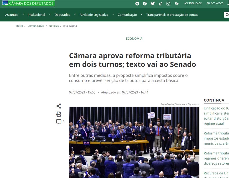 No dia 07, a Reforma Tributária foi aprova em dois turnos na Câmara Federal por 328 votos a 118 no primeiro; e 382 votos a 113 no segundo.