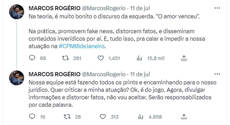 Suas últimas veiculações, no entanto, lançadas na última terça-feira, 11, traziam ameaças de análises jurídicas genéricas contra quem, segundo ele, estaria falando mentiras a seu respeito. O congressista não apontou eventuais responsáveis nem os motivos de suas palavras.