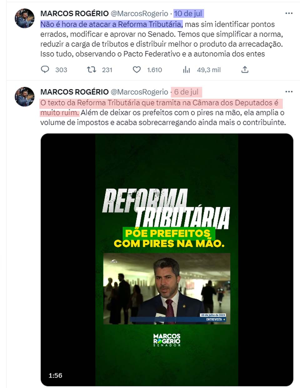 “O texto da Reforma Tributária que tramita na Câmara dos Deputados é muito ruim. Além de deixar os prefeitos com o pires na mão, ela amplia o volume de impostos e acaba sobrecarregando ainda mais o contribuinte”, anotou no dia 06 de julho.