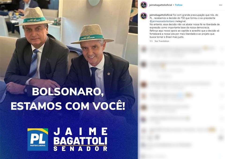 “Foi com grande preocupação que nós, do PL , recebemos a decisão do TSE que tornou o ex-presidente @jairmessiasbolsobaro inelegível”, disse.