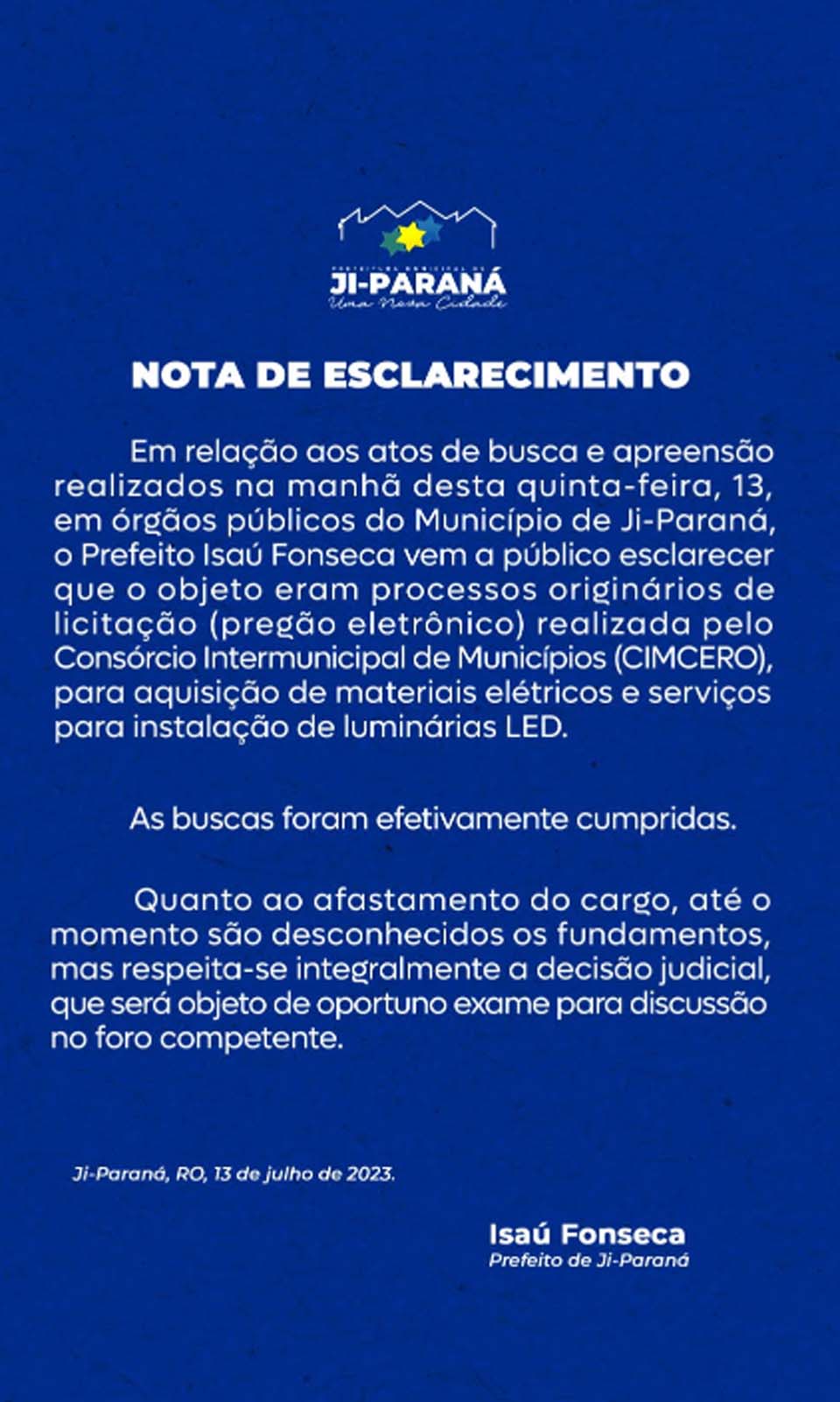 Porto Velho, RO – O prefeito afastado de Ji-Paraná, Isaú Fonseca, do MDB, se manifestou oficialmente após a deflagração da Operação Horizonte de Eventos, apresentada em conjunto pela Polícia Civil (PC/RO) e Ministério Público (MP/RO).