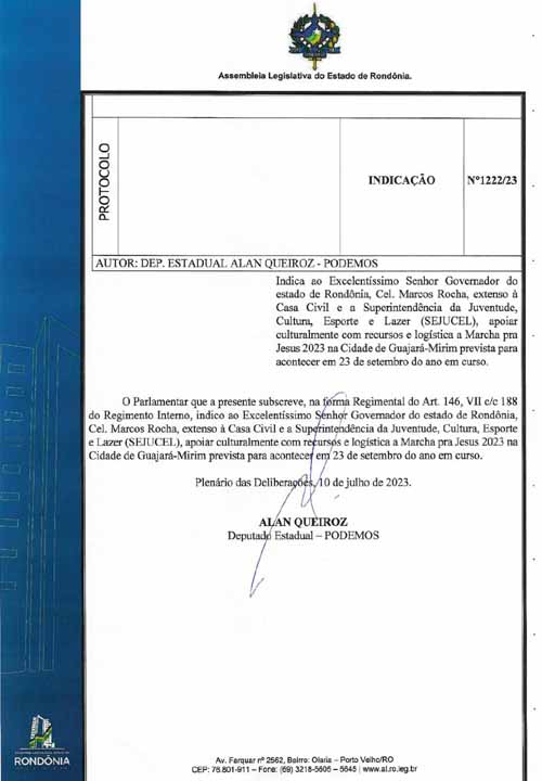 Com o objetivo de unir as pessoas em torno do amor por Cristo, o deputado estadual Alan Queiroz indicou ao Governo de Rondônia, por meio da Superintendência da Juventude, Cultura, Esporte e Lazer (Sejucel), o apoio para a realização da Marcha para Jesus. O evento está previsto para ocorrer no dia 23 de setembro deste ano.