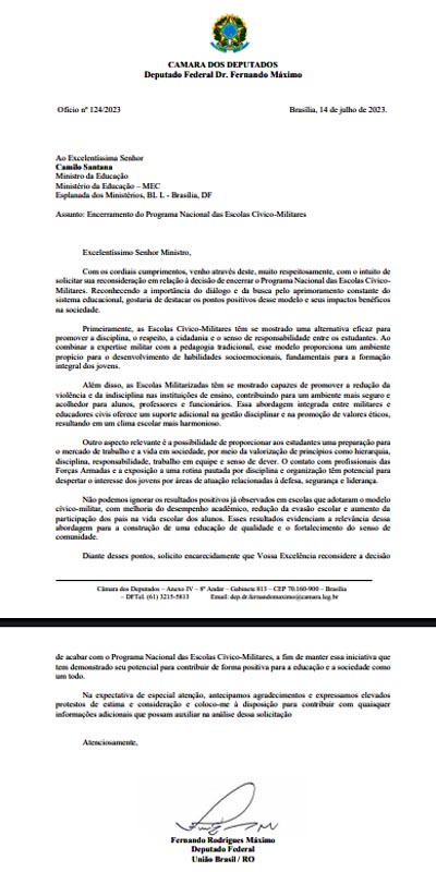 O fim do Programa Nacional de Escolas Cívico-Militares (Pecim), anunciado pelo Governo Federal, causou reação no Congresso Nacional, em Brasília-DF e chocou muitos deputados federais, entre eles o deputado Fernando Máximo (UNIÃO-RO) que tão logo recebeu a informação e, prontamente, protocolou um ofício ao Ministério da Educação pedindo para reconsiderar a decisão que extingue esta política pública.