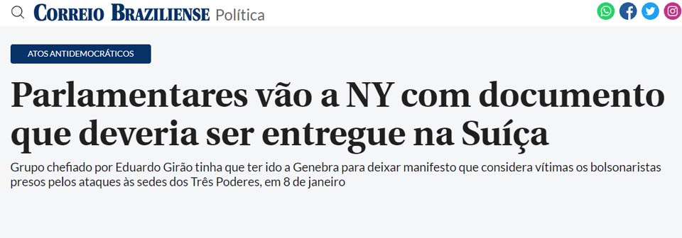 Segundo o Correio Braziliense, “Um grupo de parlamentares errou, por alguns milhares de quilômetros, o local onde deveria entregar um manifesto ao que consideram uma violação aos direitos dos presos pela invasão e depredação das sedes dos Três Poderes, em 8 de janeiro. Chefiados pelo senador Eduardo Girão (Novo-CE), os congressistas foram à sede das Nações Unidas, em Nova York, quando, na realidade, deveriam ter seguido para Genebra, na Suíça”.