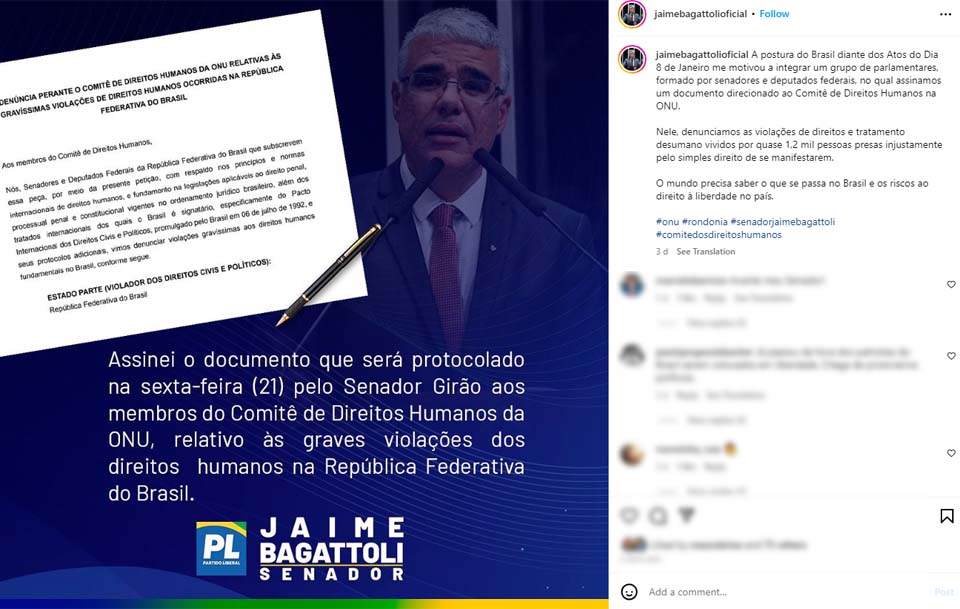 "A postura do Brasil diante dos Atos do Dia 8 de Janeiro me motivou a integrar um grupo de parlamentares, formado por senadores e deputados federais, no qual assinamos um documento direcionado ao Comitê de Direitos Humanos na ONU. Nele, denunciamos as violações de direitos e tratamento desumano vividos por quase 1,2 mil pessoas presas injustamente pelo simples direito de se manifestarem", anunciou.