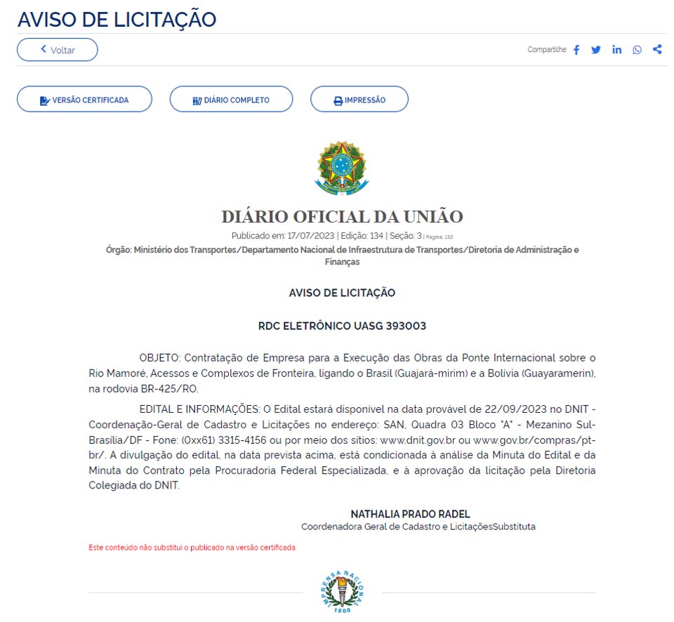 Vale ressaltar que a divulgação do edital está sujeita à análise da Minuta do Edital e da Minuta do Contrato pela Procuradoria Federal Especializada, bem como à aprovação da licitação pela Diretoria Colegiada do DNIT. Nathalia Prado Radel, Coordenadora Geral de Cadastro e Licitações Substituta, assina o aviso de licitação, que foi publicado na edição 134 do Diário Oficial da União, seção 3, página 132.