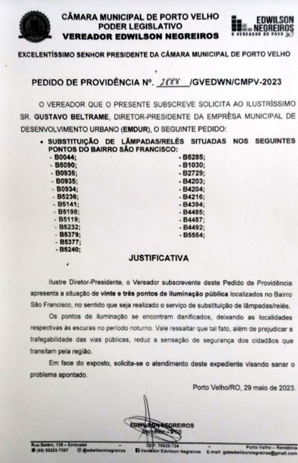 Desta vez, o pedido encaminhado diretamente às mãos do diretor-presidente do órgão, Gustavo Beltrame, abordava a necessidade de serviço de substituição de lâmpadas/relés em 24 pontos no Bairro São Francisco, zona Leste da Capital.