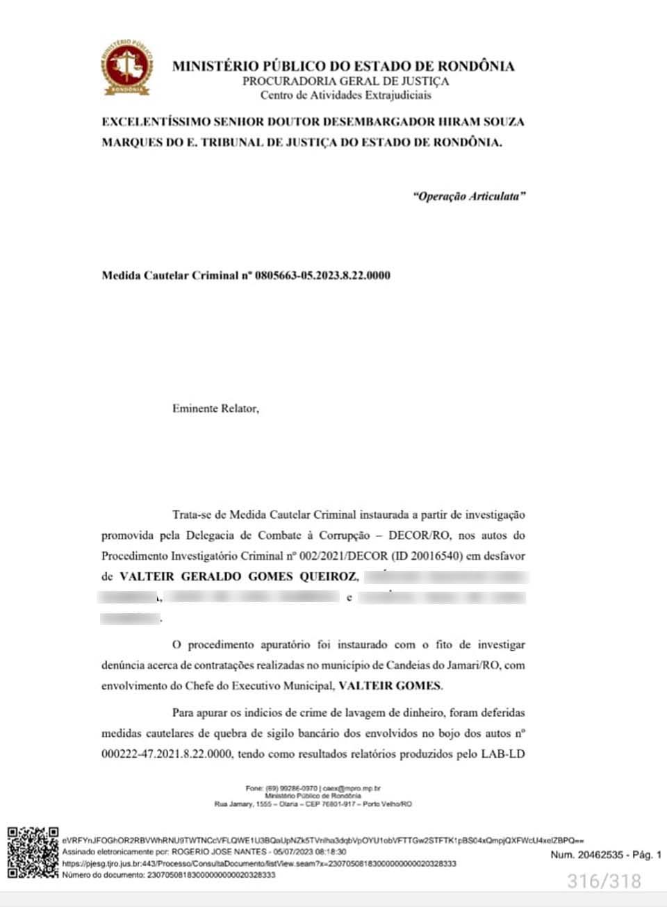 Porto Velho, RO – Em parecer apresentado nos autos da ação judicial que norteia a Operação Articulata, a dupla de promotores Ivanildo de Oliveira, procurador-geral de Justiça, e Rogério José Nantes, do Centro de Atividades Extrajudiciais (CAEX), apontaram posicionamento do órgão de fiscalização e controle sobre o prefeito afastado de Candeias do Jamari.