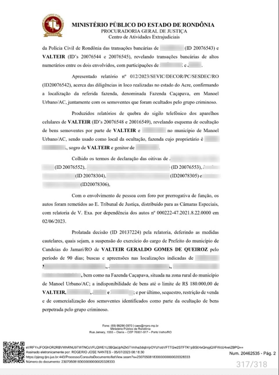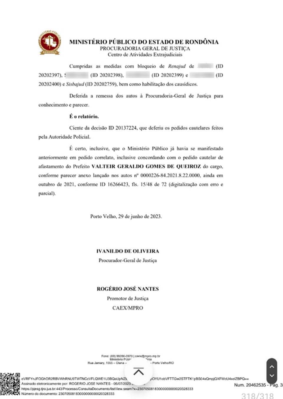 “É certo, inclusive, que o Ministério Público já havia se manifestado anteriormente em pedido correlato, inclusive concordando com o pedido cautelar de afastamento do prefeito VALTEIR GERALDO GOMES DE QUEIROZ do cargo conforme parecer anexo lançado nos autos nº 0000226-84.2021.8.22.0000, ainda em outubro de 2021 [...]”.