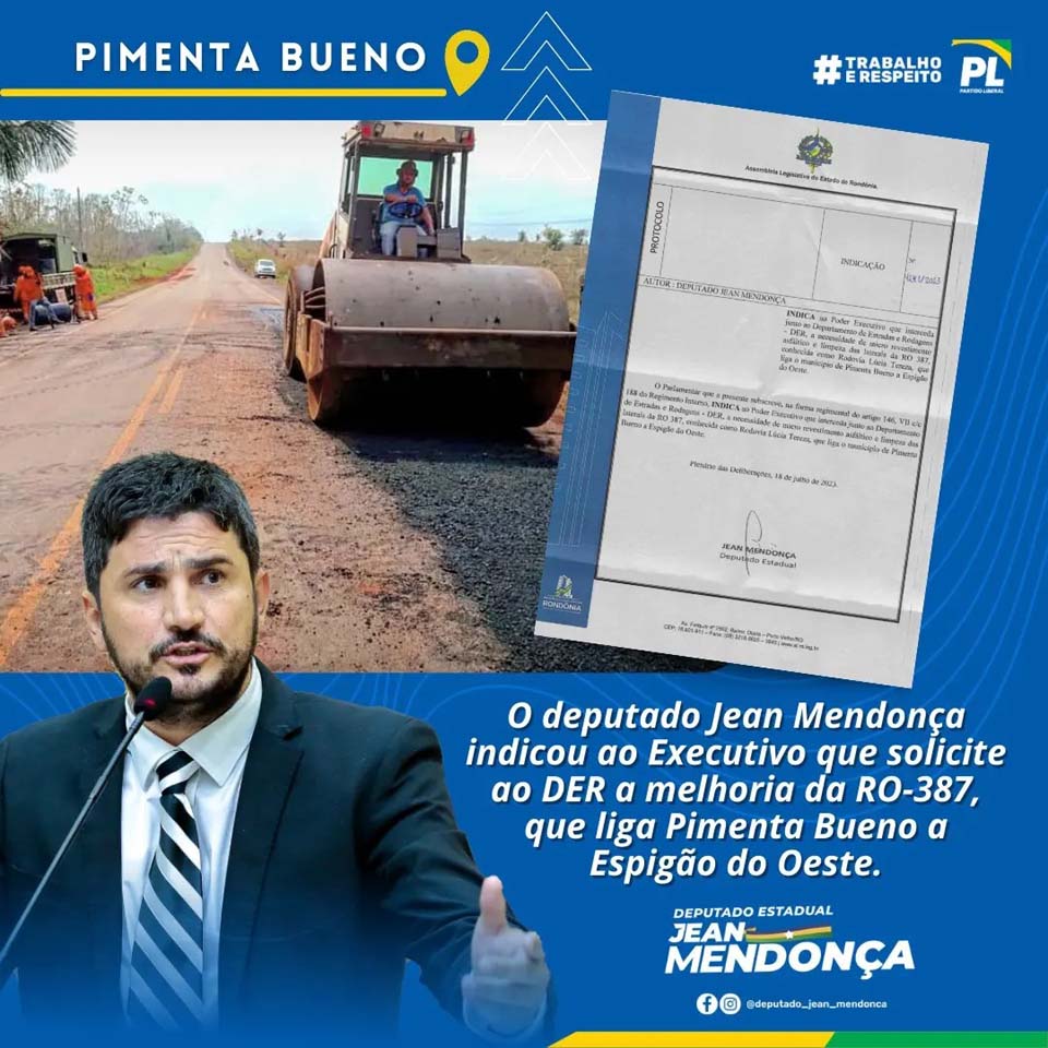 Porto Velho;RO - O deputado estadual Jean Mendonça apresentou uma indicação parlamentar ao Governo do Estado, solicitando que o Departamento de Estradas de Rodagem (DER) realize o melhoramento da RO-387 (Rodovia Lúcia Tereza), que liga os municípios de Pimenta Bueno e Espigão do Oeste.