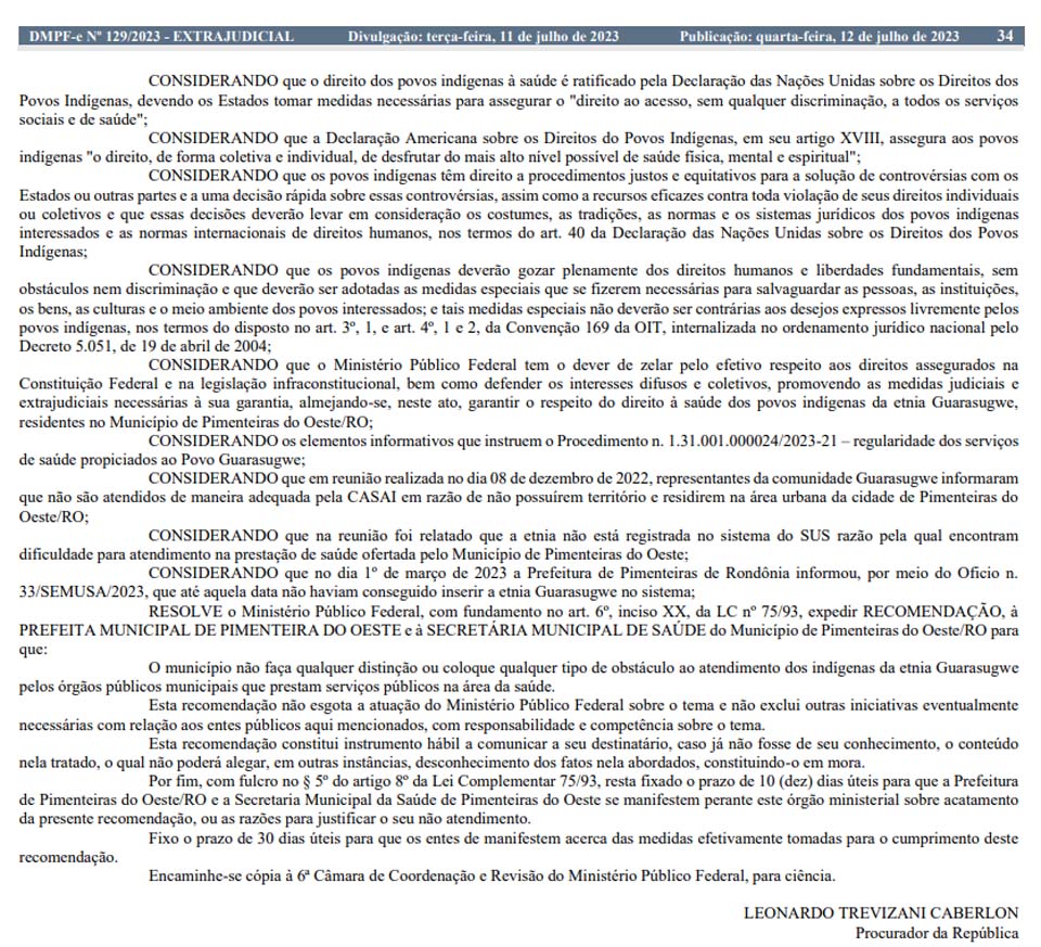 Ele também fala que em reunião realizada no dia 08 de dezembro de 2022, representantes da comunidade Guarasugwe informaram que não são atendidos de maneira adequada pela Casa de Apoio a Saúde do Índio (CASAI) em razão de não possuírem território e residirem na área urbana da cidade de Pimenteiras do Oeste.