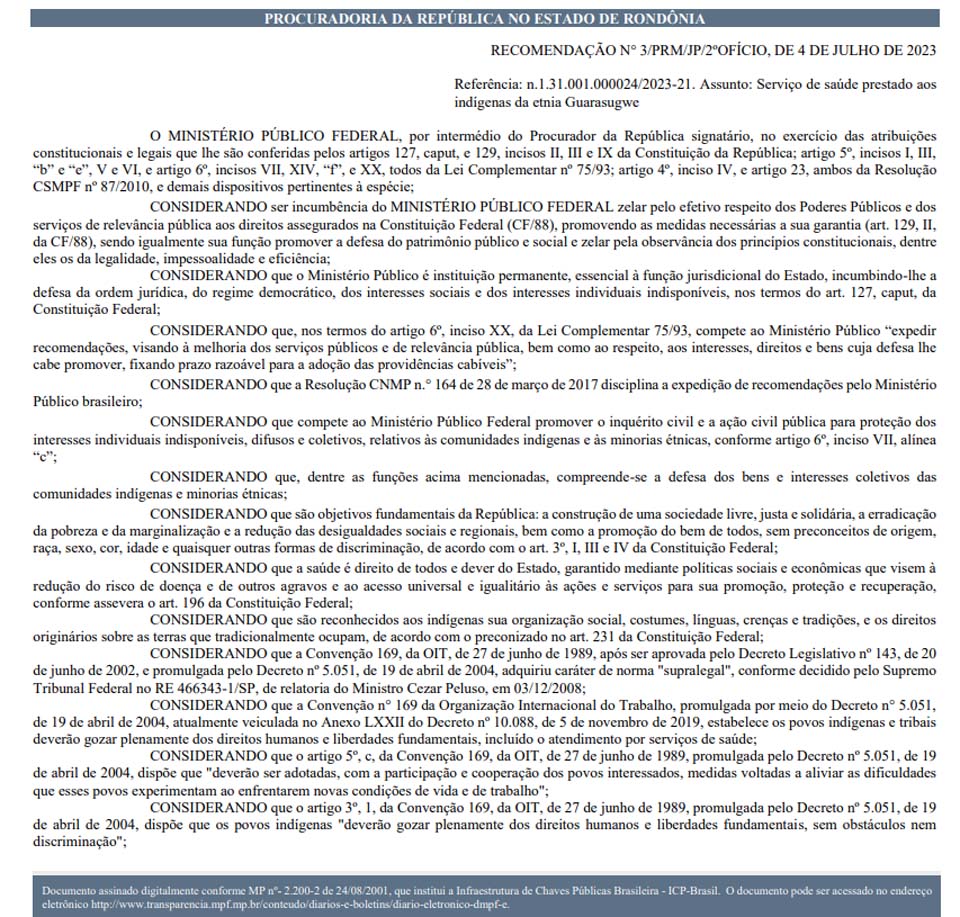 O procurador leva em consideração principalmente os elementos informativos que instruem o Procedimento n. 1.31.001.000024/2023-21 – sobre a regularidade dos serviços de saúde propiciados ao Povo Guarasugwe.