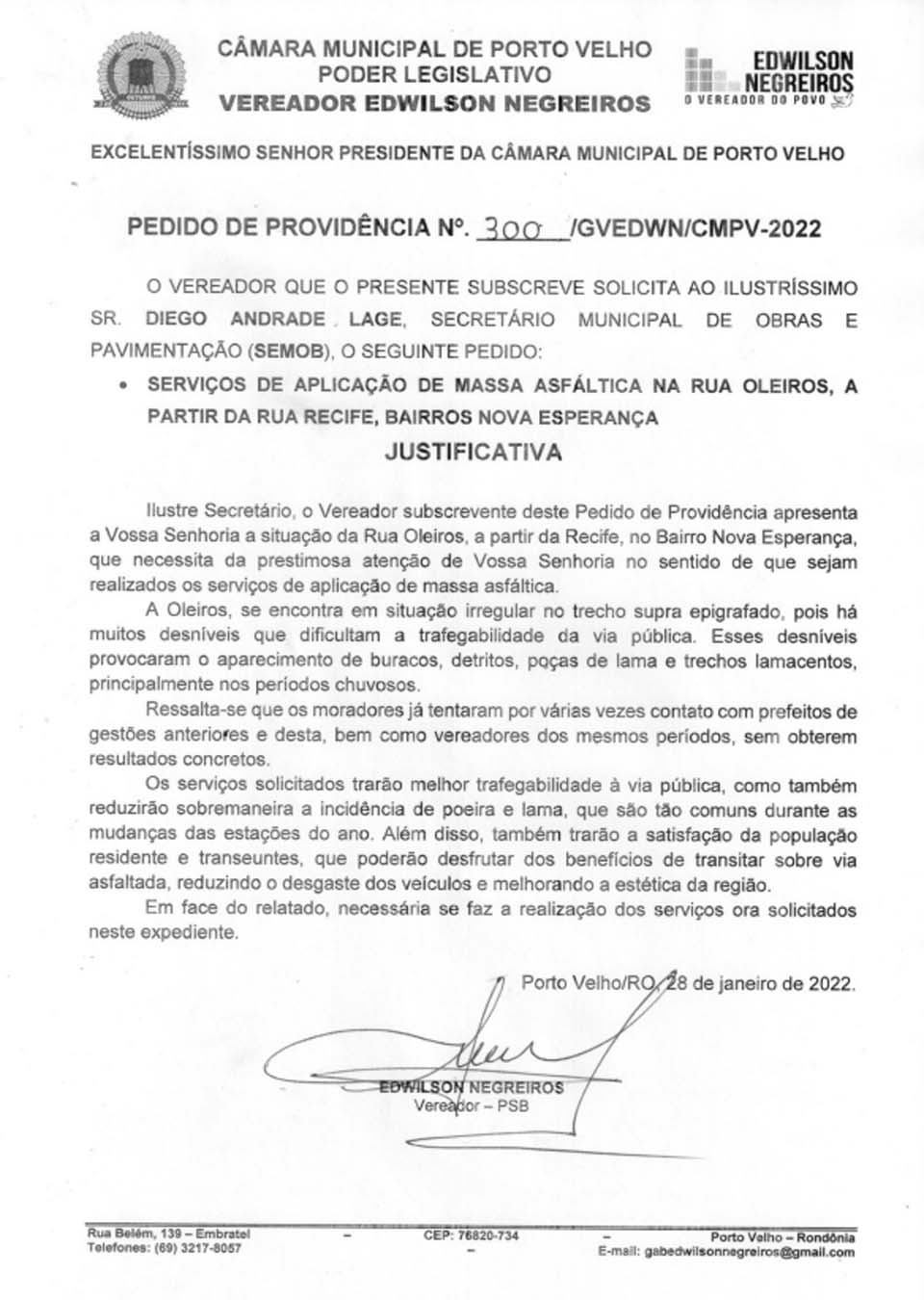 O pedido foi endereçado ao titular da Secretaria Municipal de Obras e Pavimentação (SEMOB) Diego Andrade Lage.