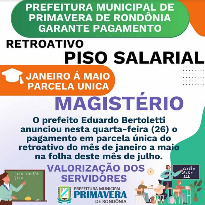 O prefeito Eduardo Bertoletti do município de Primavera de Rondônia anunciou nesta quarta-feira (26) o pagamento em cota única do valor do retroativo do piso salarial do magistério, o qual foi aprovado no mês de junho pela prefeitura municipal e a Câmara de Vereadores com planejamento de parcelar o retroativo.