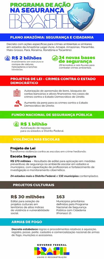 Recursos para prevenir violência nas escolas, repasses para segurança nos estados e municípios, medidas para um controle responsável de armas, edital para projetos culturais em áreas em vulnerabilidade social, um plano de ações para a Amazônia e projetos de lei para ampliar penas para quem pratica crimes em escolas e contra o Estado Democrático de Direito.