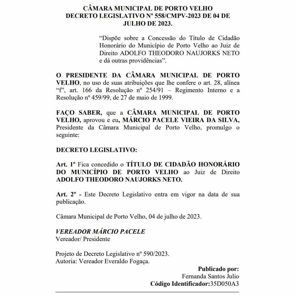O Decreto Legislativo nº 558/CMPV-2023, publicado em 4 de julho de 2023, oficializa a concessão do título ao juiz em reconhecimento ao seu trabalho exemplar no campo jurídico e à sua contribuição para a comunidade de Porto Velho.