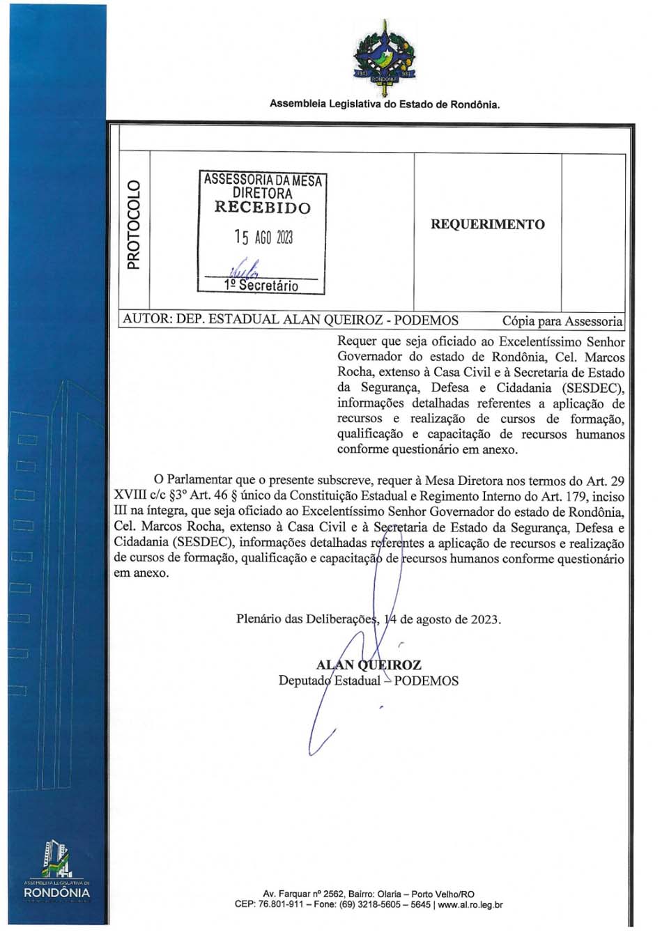 O deputado estadual Alan Queiroz (Podemos) encaminhou um requerimento ao Governo de Rondônia, por meio da Secretaria de Estado da Segurança, Defesa e Cidadania (Sesdec), em que solicita detalhes informativos relacionados à destinação de recursos e condução de programas de formação, treinamento, qualificação e capacitação de recursos humanos.