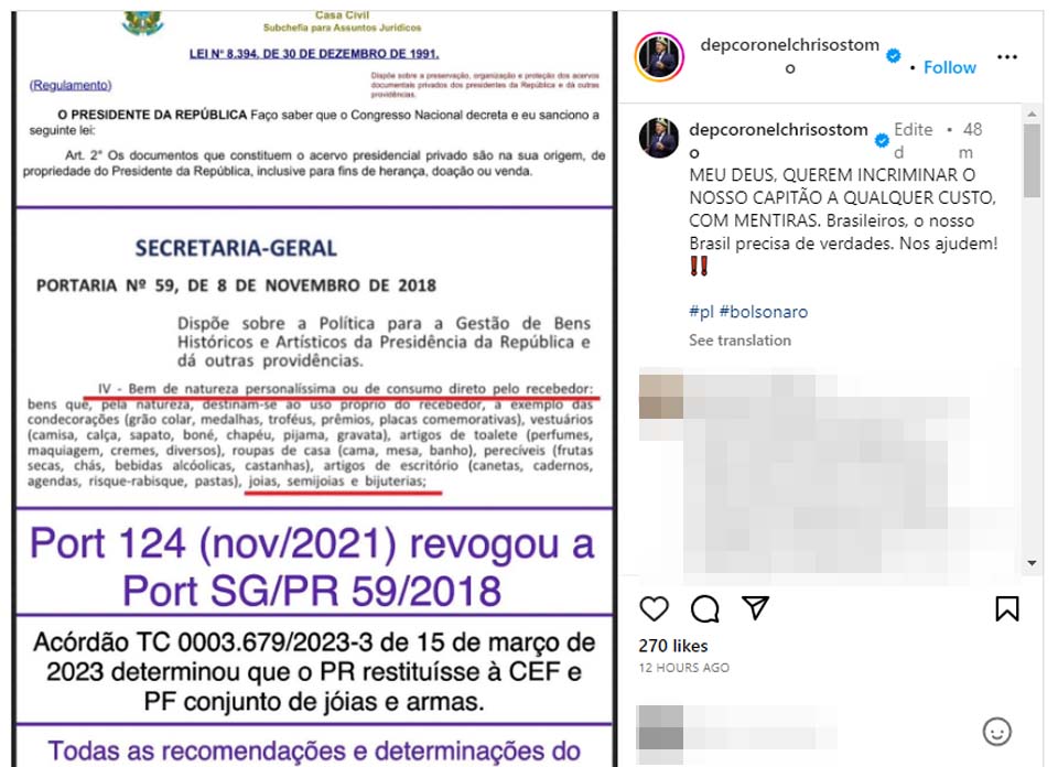 “MEU DEUS, QUEREM INCRIMINAR O NOSSO CAPITÃO A QUALQUER CUSTO, COM MENTIRAS. Brasileiros, o nosso Brasil precisa de verdades. Nos ajudem!”. O parlamentar, no entanto, não explica como nem por que a documentação exposta isentaria Bolsonaro de responsabilidade no episódio.