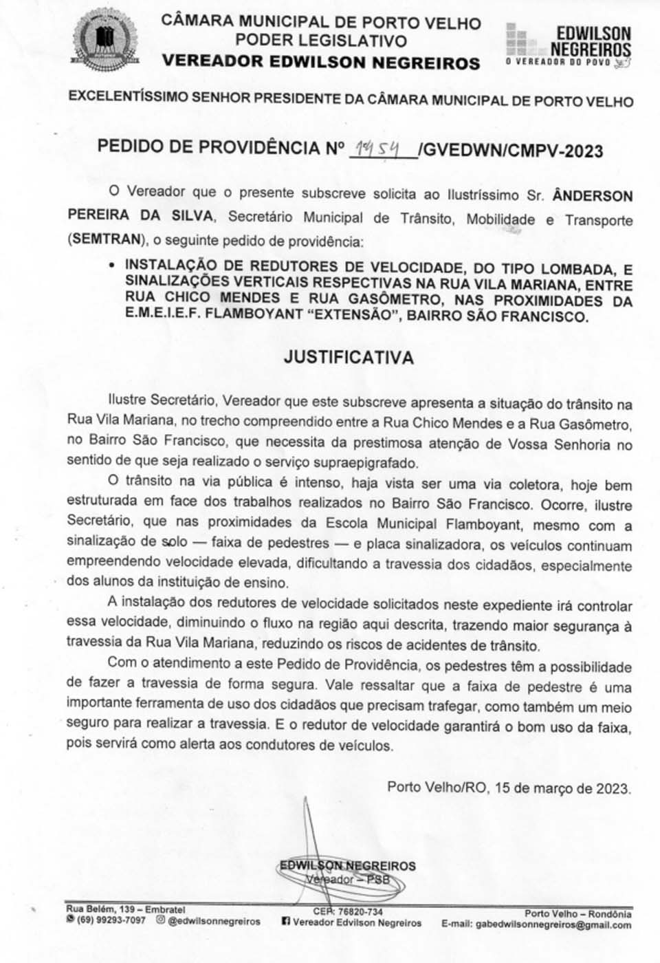 Porto Velho, RO – A Prefeitura de Porto Velho, por meio da Secretaria Municipal de Trânsito, Mobilidade e Transportes (SEMTRAN), atendeu pedido de providência apresentado pelo Gabinete de Edwilson Negreiros, do PSB.