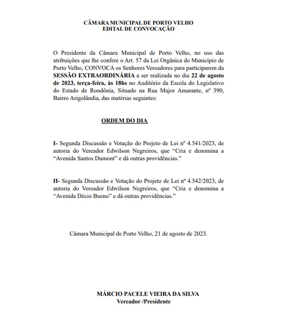 Porto Velho, RO – A Câmara de Porto Velho aprovou dois projetos apresentados pelo vereador Edwilson Negreiros, do PSB, criando e nomeando avenidas, no Bairro Industrial e Nova Esperança, zona Norte da Capital.