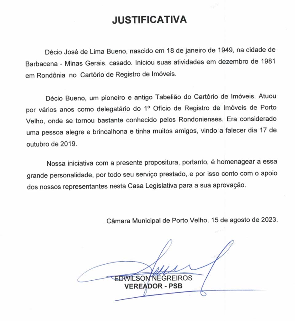 “A Câmara de Porto Velho faz jus à memória de duas figuras de suma importância. A primeira, Décio Bueno, regionalmente falando, deixou sua marca trabalhando no setor local de imóveis. Pessoa memorável, alegre, brincalhona e compromissada com o desenvolvimento da cidade. Dumont, por sua vez, levou o nome do Brasil para o mundo com sua experiência de voo usando o 14-bis”, anotou.